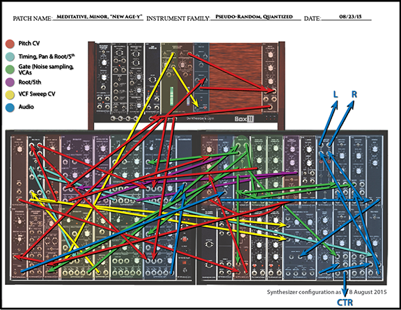 The diagram hints at just how flexible (and a bit overwhelming) an analog synth can be … and I don’t even have sequencers yet. Major, minor, augmented, diminished scales or triads; sweeping the VCF with different waveforms at different depths; changing the scale pitch with the modulation wheel; adding low-frequency noise for “interest” — just a few of the parameters that can be varied with this one patch. It pays to write down the various knob and switch settings when you get a sound you really like. Recreating it can be a bear.