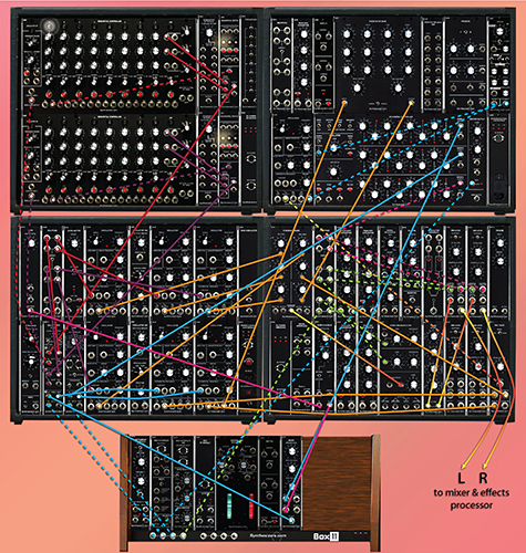 This is just a quick and mostly seat-of-the-pants MP3 capture from my Synthesizers.Com rig, now in its more or less finished incarnation with three sequential controllers (one Q119 and two Q960s). Each sequencer is routed to two oscillators tuned at some diad or other. The Quantizer and Quantizer Aid are fully populated and set to Major Scales. The third bank of each Q960 is used for note-timing and the third bank of the Q119 is routed to the VCAs for note-by-note dynamics. All oscillators run on their own speeds (not necessarily the best way to go about this) and the Q119 gate also controls the envelope to the VCAs. LF noise is sampled and added to Bank 1 of the Q119 to add at least a little randomness to the output.