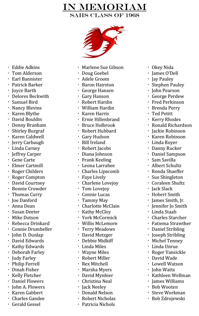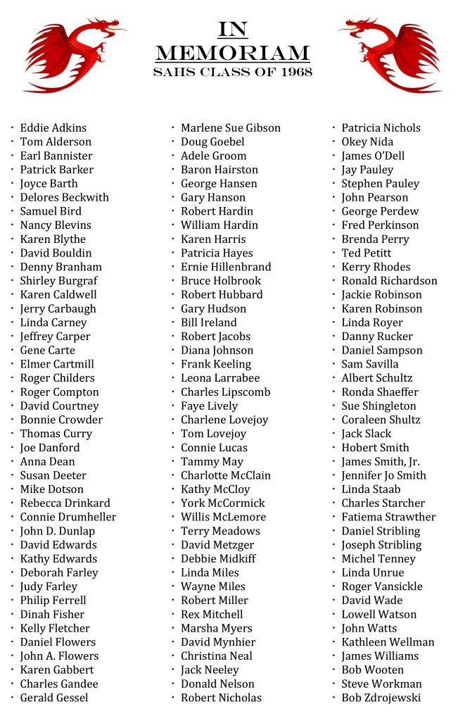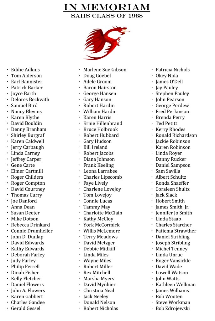 SAHS Class of 1968 “In Memoriam” Share this: Share on Facebook (Opens in new window) Facebook Share on X (Opens in new window) X Like Loading...